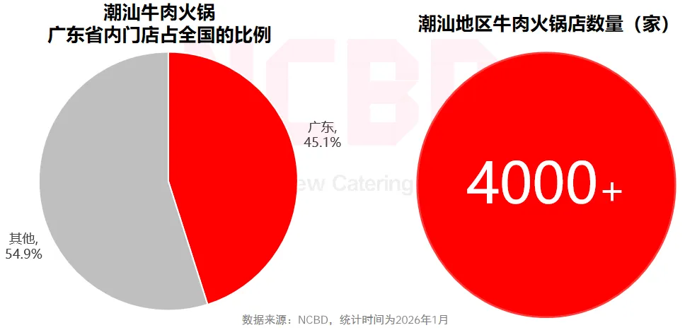 (3)从全国范围来看,潮汕牛肉火锅的门店分布呈现出明显的地域集中性。广东省作为发源地和核心市场,门店数量占全国的45.1%。截至2025年12月底,潮汕地区牛肉火锅店超过4000家。随着头部品牌输出和供应链的逐渐完善,潮汕牛肉火锅正向华东、华中以及西南地区渗透