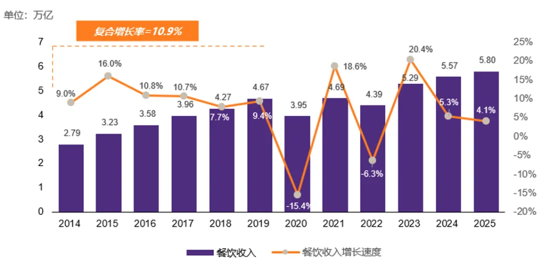 2014-2019年,中国餐饮市场稳定发展,期间国内餐饮市场销售收入复合增长率为10.9%。2023年疫情后,餐饮市场规模增速较2022年相比上升20.4%,较2019年相比上升13.2%,基本恢复到了疫情前的水平。但是,2024年与2025年受消费内需不足的影响,餐饮业的增速大幅回落,年增速分别回落至5.3%与4.1%。