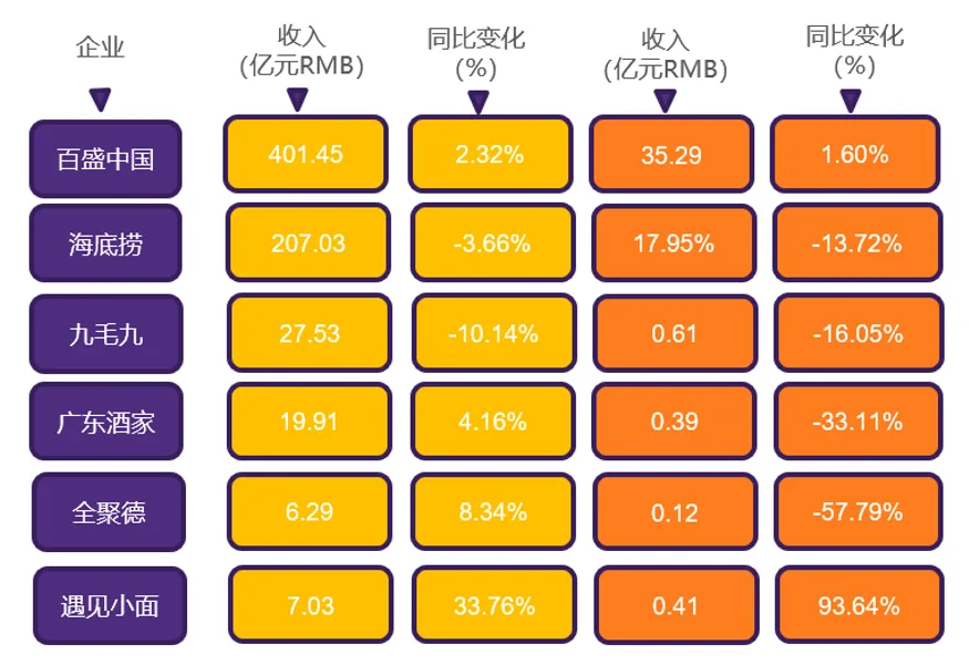 随着消费需求与经营环境的变化,海底捞、九毛九、广东酒家与全聚德等传统餐饮企业整体增长乏力,甚至出现收入负增长的情况,业绩更是呈现出整体大幅度下滑的趋势。百盛中国主要经营肯德基、必胜客餐厅,比较适应当下的经营环境与年轻化的客户需求,在上半年维持了收入与利润双增长的局面。