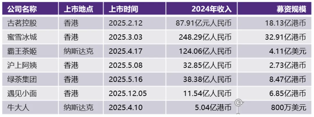2025年,中国餐饮行业迎来了一波前所未有的港股上市热潮,在古茗控股、蜜雪冰城、沪上阿姨、绿茶集团与遇见小面等众多餐饮企业成功港股上市的同时,巴奴火锅与老乡鸡等老牌餐饮企业的港股上市也在推进过程中。与此同时,2025年4月,霸王茶姬登陆纳斯达克,募集资金超过4亿美元,成为首个在美国上市的中国新茶饮品牌,为其国际化扩张铺路。 2026年1月,比格披萨与袁记水饺也相继向港交所递交上市申请,港股上市热的趋势在2026年将继续。