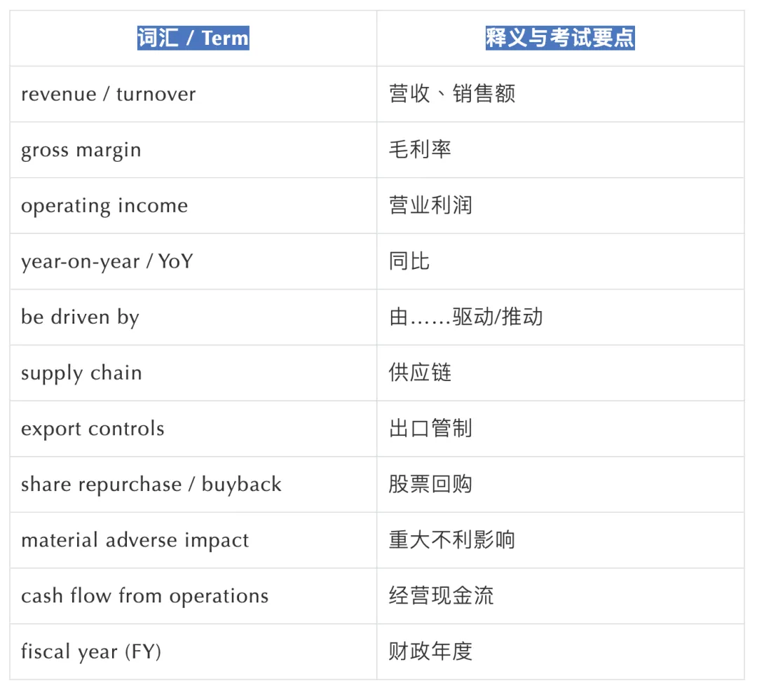 share repurchase authorization(回购授权限度)、Board of Directors(董事会)、common stock(普通股)、without expiration(长期授权、无到期日)——四个词组在 BEC “公司治理”题型中高频且得分点。以下词汇均直接出自英伟达 10-K 财报原文,是 BEC 阅读和写作的核心考验点。学了这么多原文,一定要内化成写作输出。以下三个模板,直接拿来用:“Revenue for [period] was [amount], up [X]% from a year ago, driven primarily by [key factor].”……期间营收达……,同比增长……%,主要由……驱动。“The [risk factor] has led and could lead to [adverse outcome], which may have a material adverse impact on our business, operating results, and financial condition.”……风险已导致并可能继续导致……,这可能对公司业务、经营成果及财务状况产生重大不利影响。“Our strategy is to [action], bringing together [resources], in order to create [value] for [target market].”我们的战略是……,整合……,以为……目标市场创造……价值。英文财报的语言不是象牙塔,而是与 BEC 的考题用语高度重叠。建议熟读本文精选的词汇与句型。并逐步把这种“看真实文件学英语”的方法应用到备考中 ,语感与词汇水到渠成自然提升。