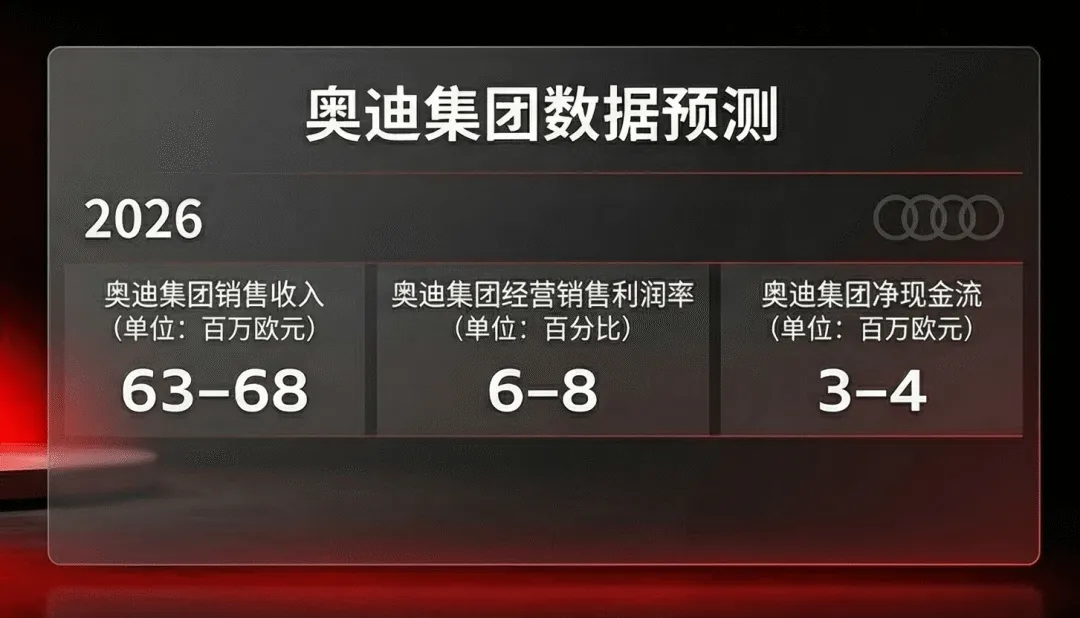 站在当下回看,2025年更像是奥迪的一次“压力测试”:在复杂环境中验证体系韧性,同时为下一阶段积蓄动能。而2026年的数据预测,则释放出更明确的修复信号:销售收入预计在630亿至680亿欧元之间,经营销售利润率目标回升至6%至8%,净现金流维持在30亿至40亿欧元区间。