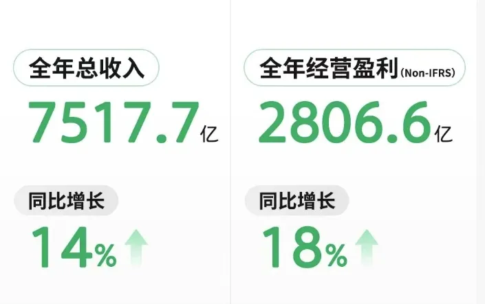 3月18日,腾讯发布2025年第四季度及全年业绩报告。报告显示,腾讯第四季度营收同比增长13%至1943.7亿元,全年营收达7517.7亿元,非国际财务报告准则下的经营盈利为2806.6亿元。其中,ToB业务(金融科技及企业服务)全年营收2294.3亿元创新高;企业服务单季收入增长22%。这主要得益于云服务与微信小店带货技术服务的拉动。受供应链持续优化和PaaS、SaaS的增长带动,腾讯云业务收入显著增长,录得全年规模盈利。