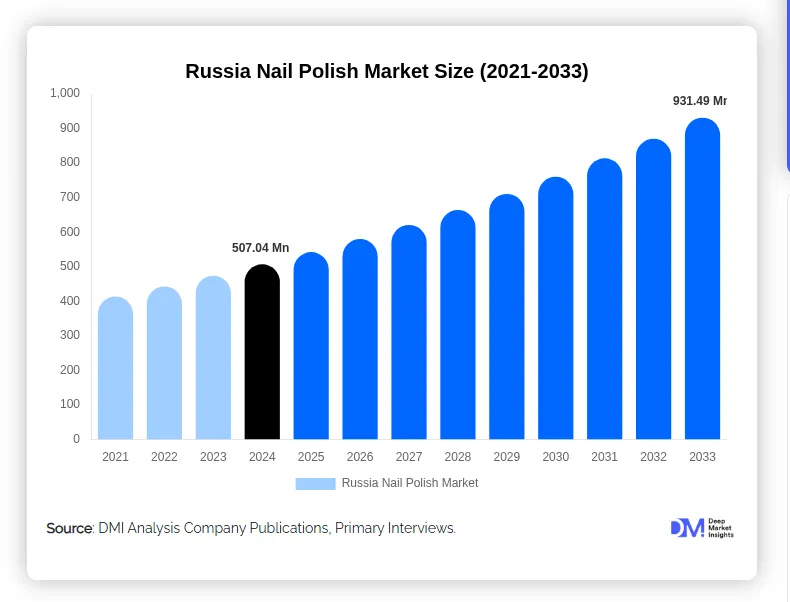 另外一份市场研究报告显示,俄罗斯指甲油市场在 2024年约为5.07亿美元,并预计到2033年增长至9.31亿美元,年复合增长率接近 7%。