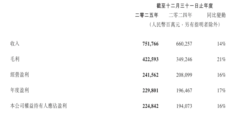全年营收7517.7亿元,同比增长14%;非国际财务报告准则经营利润同比增长18%。公司权益持有人应占盈利2248.42亿元,同比增长16%。
