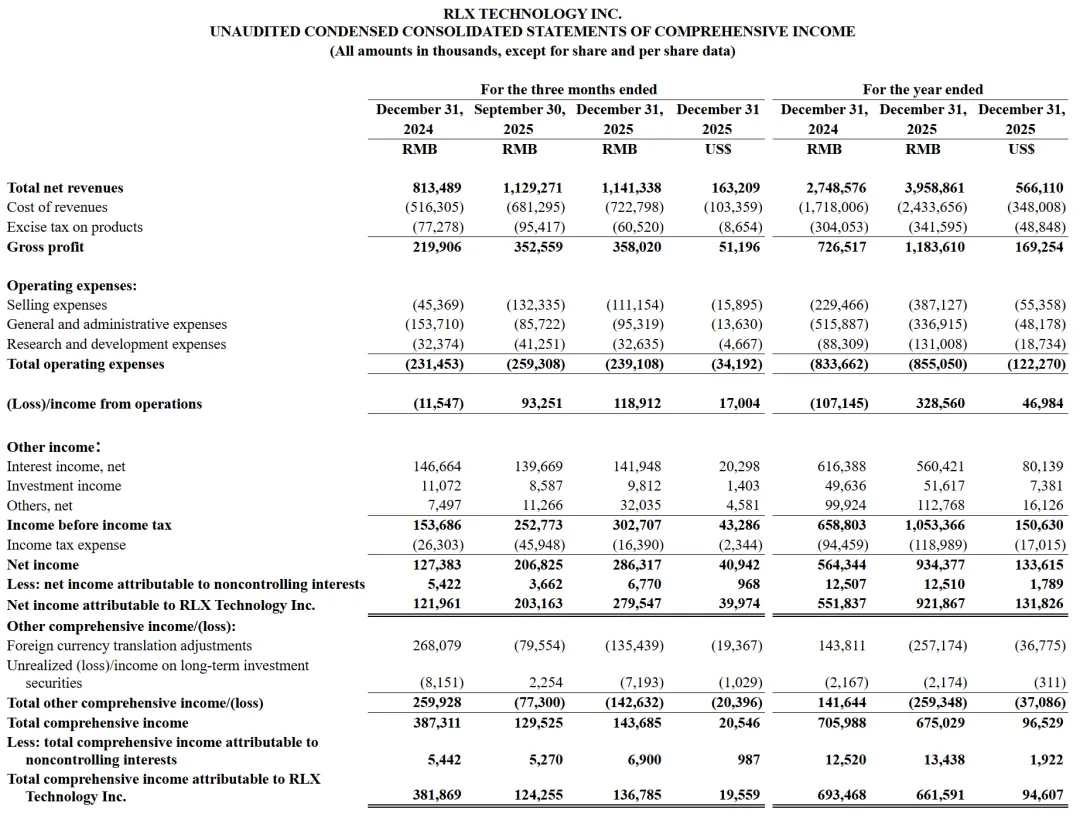 2026 年 3 月 13 日,悦刻母公司雾芯科技(纽交所:RLX)发布 2025 年第四季度及全年未经审计财报,交出了一份高质量的增长答卷。数据显示,公司 2025 年全年营收、净利润双位数增长,运营端实现扭亏为盈,而国际业务的强势崛起成为本次财报的最大亮点,第四季度国际市场营收占比超七成,成为推动公司发展的核心动力。2025 年,雾芯科技全年实现营收 39.59 亿元(约 5.66 亿美元),较 2024 年的 27.49 亿元同比增长 44%,营收规模实现大幅跃升。盈利方面表现更为亮眼,公司全年净利润达 9.34 亿元(约 1.34 亿美元),较上年同期的 5.64 亿元增长 65.6%;若按 Non-GAAP 计算,全年净利为 11.62 亿元(约 1.66 亿美元),同比 2024 年的 9.41 亿元增长 23.5%。运营层面,雾芯科技实现了从亏损到盈利的关键跨越,2025 年运营利润达 3.29 亿元(约 4698 万美元),而 2024 年同期为 1.07 亿元的运营亏损,体现出公司经营效率的显著提升。第四季度作为全年收官阶段,业绩同样表现不俗。该季度公司营收 11.41 亿元(约 1.63 亿美元),较 2024 年同期的 8.14 亿元增长 40.3%;净利润 2.86 亿元(约 4090 万美元),同比 2024 年四季度的 1.274 亿元大幅增长 124.8%;经调整后的四季度净利为 3.23 亿元(约 4620 万美元),同比增长 27.6%,延续了全年的增长势头。拆解 2025 年第四季度经营数据,雾芯科技在盈利质量、成本费用管控上均有可圈可点的表现。成本端,四季度成本 7.23 亿元(约 1.03 亿美元),同比增长 40%,与营收增速基本持平,而产品消费税为 6052 万元,较 2024 年同期的 7728 万元有所下降,一定程度上减轻了成本压力。毛利方面实现逆势增长,四季度毛利 3.58 亿元(约 5120 万美元),较 2024 年同期的 2.2 亿元增长 62.7%,毛利率稳定在 31%,较此前季度有明显提升,反映出公司产品盈利能力的增强。费用管控上,四季度总费用 2.39 亿元(约 3420 万美元),同比仅增长 3%,处于低位增长区间。其中销售费用 1.11 亿元(约 1590 万美元),同比增加主要因薪酬福利支出提升,系公司业务扩张的合理投入;一般及行政费用 9530 万元(1360 万美元),较 2024 年同期的 1.537 亿元大幅下降,核心原因是股权激励支出减少;研发费用则保持稳定,四季度为 3260 万元,持续的研发投入为公司产品创新和市场拓展提供支撑。盈利端的改善也体现在运营利润上,2025 年四季度雾芯科技实现运营利润 1.189 亿元(1700 万美元),运营利润率达 10%,而 2024 年同期为 1150 万元的运营亏损,实现了从亏到盈的反转;Non-GAAP 口径下,四季度营业利润 1.581 亿元(2260 万美元),同比 2024 年同期增长 37.9%。此外,四季度公司所得税费用 1640 万元,较 2024 年同期的 2630 万元有所减少,进一步增厚了利润。对于 2025 年的业绩增长,雾芯科技创始人、董事长兼 CEO 汪莹表示:公司实现的显著高质量增长,核心得益于全球化战略的持续推进,国际业务的快速发展成为主要驱动力,同时国内监管环境的持续完善,优化了合规企业的竞争格局,推动中国内地业务实现温和复苏。雾芯科技 CFO 陆超进一步补充,2025 年公司收入增长主要来自三大方面:国际业务的持续扩张、海外战略投资带来的协同效应,以及中国内地业务的复苏。其中国际业务的增长尤为突出,2025 年第四季度国际市场营收占比达到 76.5%,较三季度的 72% 继续提升,成为公司营收的第一增长极,也印证了公司全球化布局的成效。从季度营收走势来看,雾芯科技 2025 年各季度营收均保持同比增长,其中一季度同比增 47%、二季度增 40%、三季度增 49%、四季度增 40.3%,增长态势稳定,而国际业务的持续发力,成为各季度营收增长的重要支撑。截至 2025 年 12 月 31 日,雾芯科技的财务状况保持稳健,资产规模实现增长,现金流充裕。公司总资产达 179 亿元(约 25.64 亿美元),其中流动资产 112 亿元(约 16 亿美元),非流动资产 67.26 亿元(约 9.6 亿美元)。负债方面,公司总负债 22 亿元(约 3.14 亿美元),其中流动负债 19.66 亿元(约 2.81 亿美元),非流动负债 2.33 亿元,负债规模处于合理区间;股东所有者权益达 157 亿元(约 22.5 亿美元),体现出较强的财务抗风险能力。现金流方面,公司持有现金及现金等价物、受限现金、短期银行存款净额、短期投资、长期银行存款净额及长期投资证券净额合计 157.321 亿元(22.497 亿美元),充裕的现金储备为公司后续的全球化扩张、研发投入和业务布局提供了坚实的资金保障。整体来看,2025 年雾芯科技凭借全球化战略的落地和国内业务的复苏,实现了业绩和经营效率的双重提升,而国际业务的高占比和高增长,为公司未来发展奠定了基础。在国内电子烟行业监管日趋完善、海外市场需求持续释放的背景下,雾芯科技的全球化布局有望持续兑现业绩,成为公司长期增长的核心支撑。MBMC知识库:2025年民营企业香港、A股、美股上市优劣势对比MBMC知识库:美国证监会SEC如何审批上市?为什么比A股、港股简单辣么多!MBMC知识库:2025年美国上市需要递交哪些申请材料?秘籍请查收!MBMC知识库:2025年中国企业如何赴美上市?需要哪些中介机构?赴美上市需要多少钱?