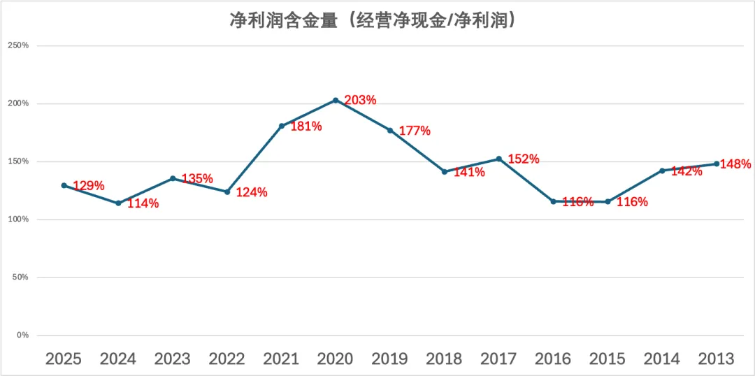 2025年,福耀玻璃经营活动现金流量净额与净利润的比例为129%,超过1,反映出福耀玻璃赚到的净利润是真金白银,净利润质量非常高,绝不是赚了一堆应收帐款或则存货……从下图我们可以看到,福耀玻璃的净利润含金量一直非常高,每年赚到的都是如假包换的现金!