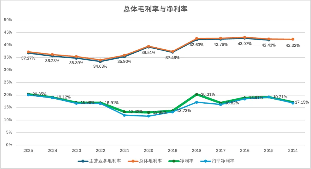 2025年,福耀总体毛利率为37.27%,比2024年上升1%左右,自2022年以来持续提高;净利率20.35%,同比提高1.2%左右,自2020年以来保持持续提高的良好态势。