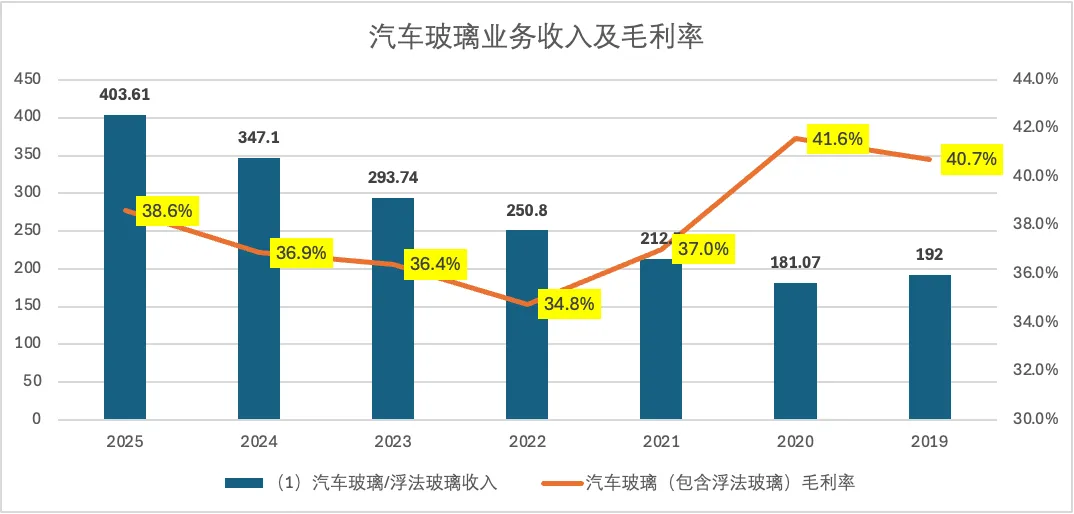 首先是汽车玻璃业务。2025年营业收入403.6亿元左右,同比增长16%左右,依然保持了良好的增长势头;毛利率38.6%,同比提高大约1.7%,主要得益于高附加值汽车玻璃产品销售占比持续提升,2025年度占比总营收比2024年度提升了5.44%,达到大约63.6%。高附加值产品议价能力强,可有效应对汽车厂商对普通玻璃产品每年逐步降价的要求,其营收占比逐年提高,可帮助福耀玻璃维持毛利率未来几年持续提高的良好态势。