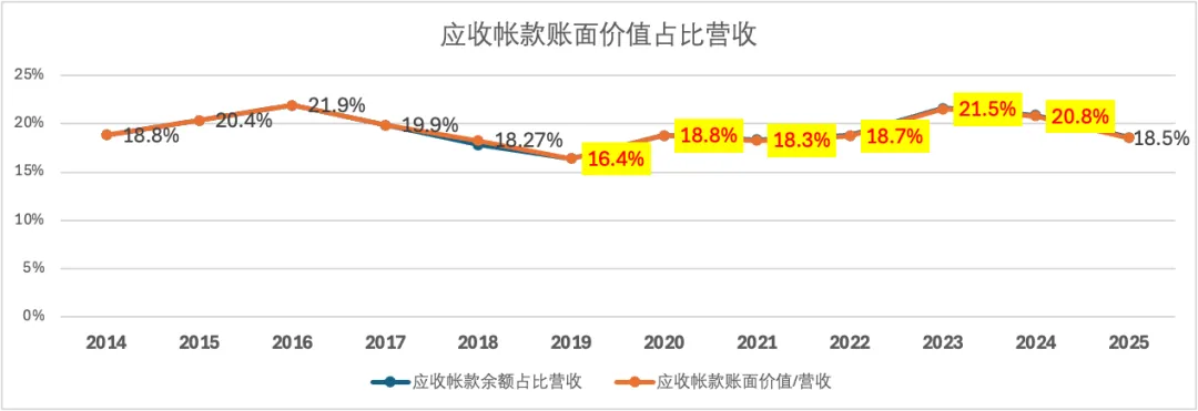 福耀玻璃的应收帐款巨大,虽然福耀为规避风险为应收帐款购买了保险,但通过观察应收帐款的状况能够帮助我们了解福耀玻璃的经营状况,包括营收增长的质量和福耀在价值链上的话语权等。2025年,福耀应收帐款余额占营收比例为19%,比2024年下降2%,应收帐款帐面价值占比营收比例类似,反映福耀玻璃在2025年度实现的营收增长并不是通过放松信用实现的,增长质量可靠。另外,文章开始提及,2025年应收帐款周转天数66天,同比2024年减少了5天,也反映应收帐款质量有所好转。另外,2025年度应收票据4.33亿元(2024年8.12亿元),特别是商业承兑票据0.48亿元(2024年4.9亿元)同比大幅下降,也说明应收款项的质量有了较为明显的提升。