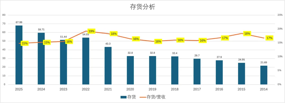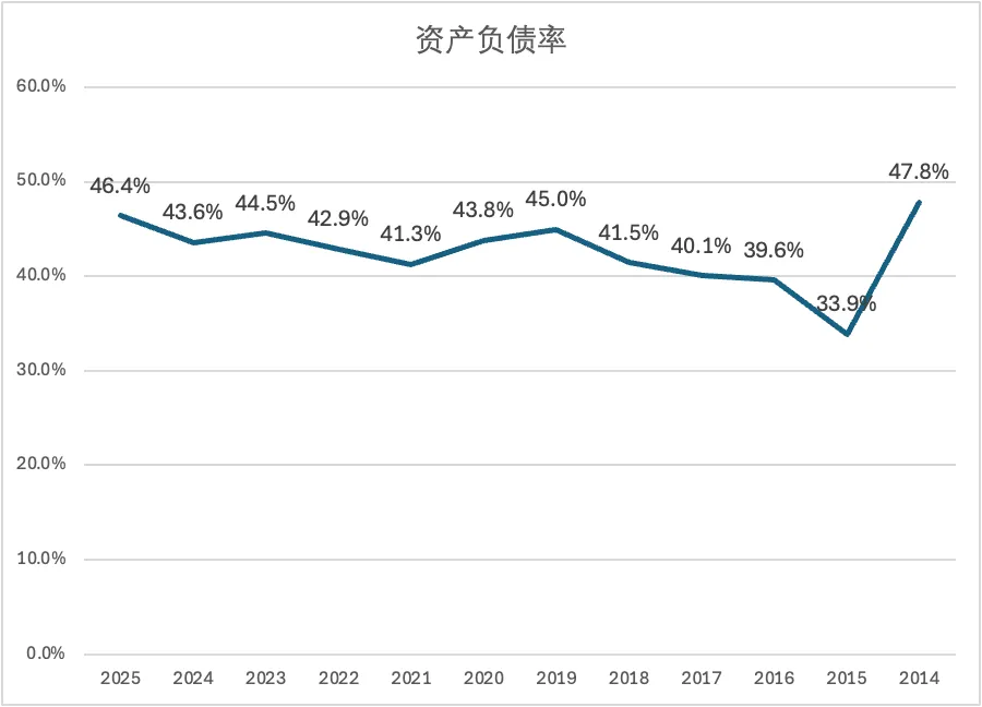 2025年资产负债率高达46.4%。资产负债率自2021年以来持续攀升,经营性负债(总负债-合同负债-预收货款)持续上升,将增加经营风险,不得不令人关注。