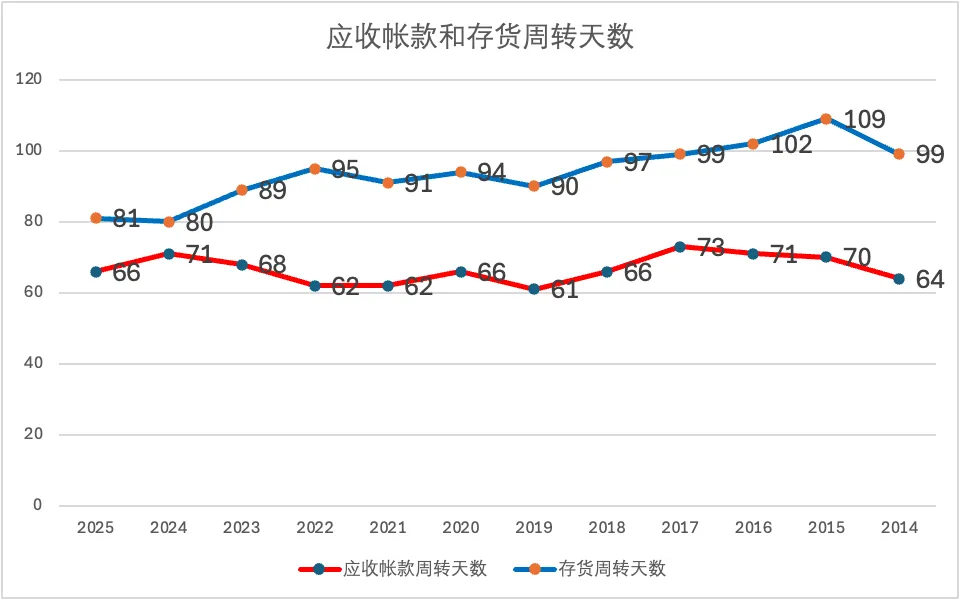 2025年末,福耀存货帐面价值占营收比例为14.8%,与2024年末15.2%基本持平,也反映经营有所改善。存货周转天数81天,比2024年多1天,基本持平。