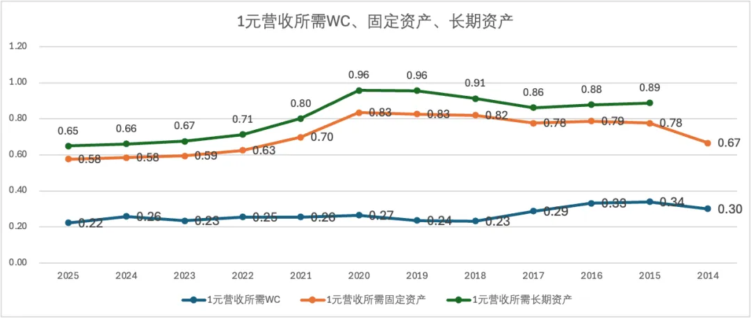 无论从1元营收所需要的营运资本(WC),还是1元营收所需要的固定资产(固定资产+在建工程),或者1元营收所需长期资产(固定资产+在建工程+无形资产+商誉+长期待摊费用)来看,自2020年以来,福耀都保持了持续稳定向好的趋势。2025年1元所需WC为0.22元,同比2024年0.26元有较为明显的改善;1元所需固定资产0.58元,与2024年持平。2025年1元所需长期资产0.65元,与2024年0.66元有所改善。