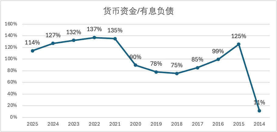 偿还债务能力方面,2025年货币资金与有息负债比例为114%,货币资金依然足够覆盖有息负债,偿还能力无忧。