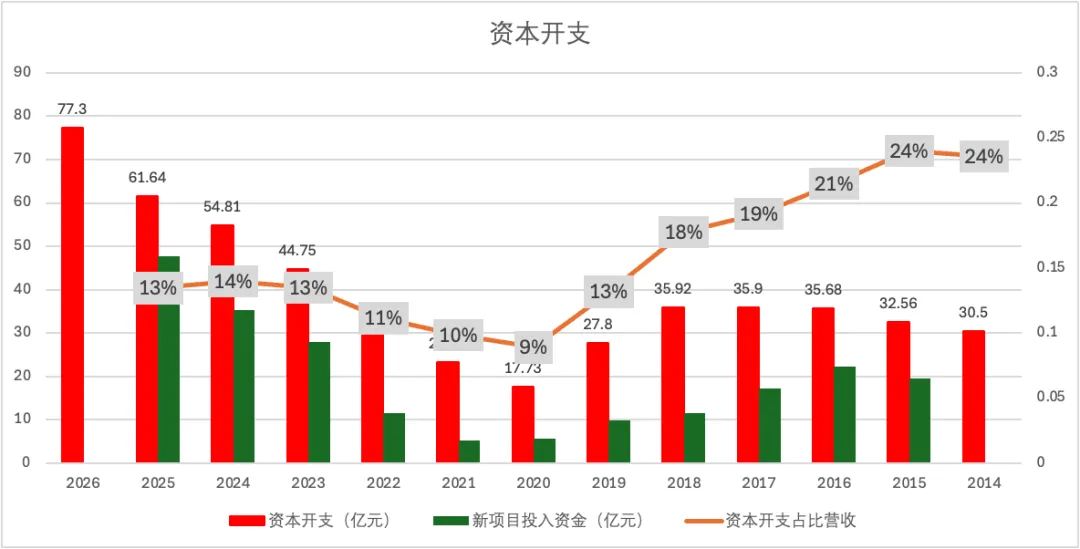 自2020年以来,资本开支持续高速增长,2025年高达61.64亿元。年报披露,2026年资本开支预计高达77.3亿元,同比增长25%。如此巨大的资本开支,后续如果不能如期带来足够的营收增量,将对未来几年的折旧费用产生巨大负担,严重拖累未来几年的净利润,足以引起投资者的担忧。