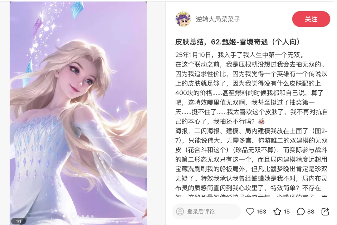 接着向角色精神内核深挖,在《冰雪奇缘》联动中,甄姬没有简单套用艾莎经典的蓝裙,而是巧妙采用了双形态设计:以“骑马归来”的白裙为核心造型展现冲破桎梏的觉醒,同时将筑起冰雪城堡的经典蓝裙作为大招随机触发的另一形态。完整再现了角色找寻自我的心路历程。