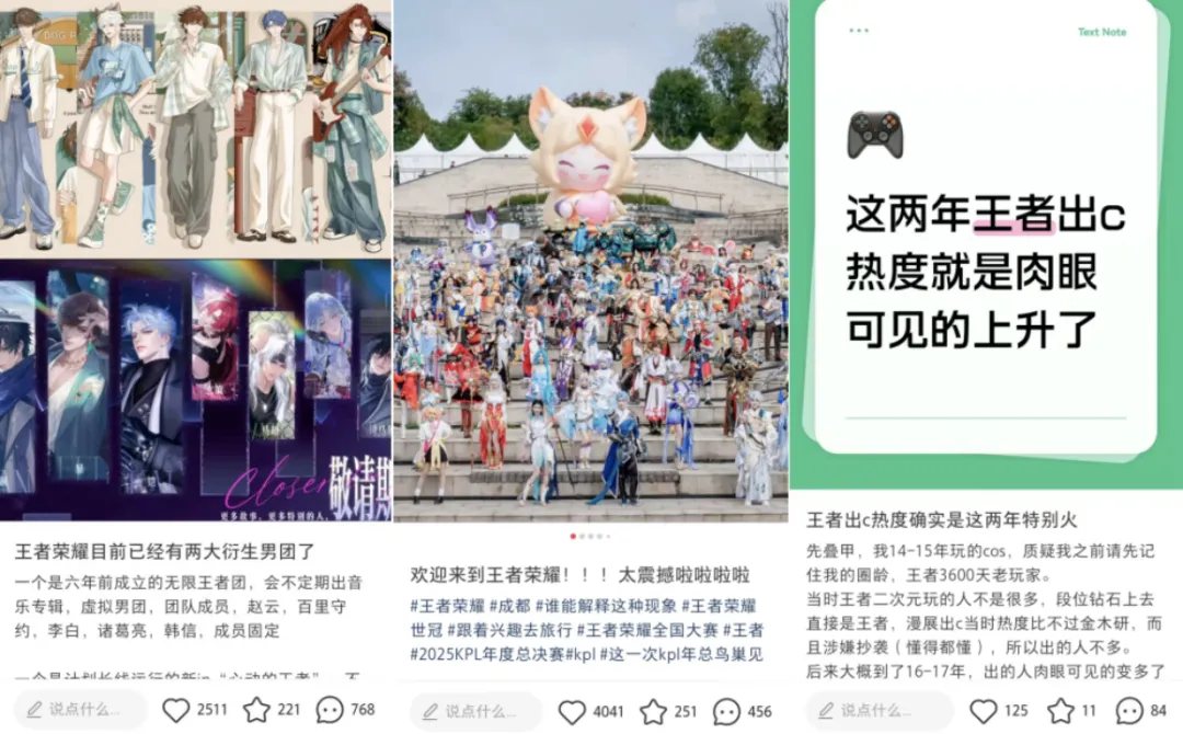 无论是十周年多城线下派对还是各类漫展,王者相关展区始终保持着极高的人气,玩家对英雄限定物料的追捧热度不减。同时,衍生子IP也展现出明显的破圈潜力:虚拟男团“无限王者团”与情感陪伴企划“心动的王者”在线下见面会和社交平台上均引发了热烈讨论。越来越多玩家自发成为王者英雄的Coser,用热爱打破次元壁。