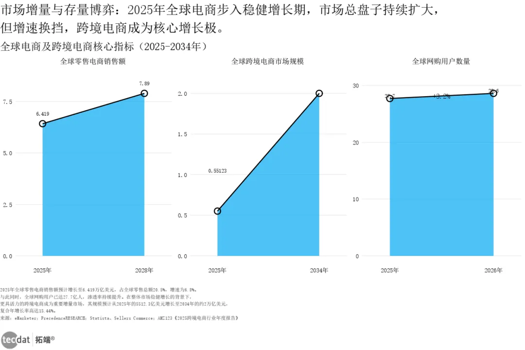2025年全球电商进入稳健增长期,但增速换挡。全球零售电商销售额预计达6.419万亿美元,同比增长6.8%;全球网购用户突破27.7亿人。更具活力的跨境电商成为增量主角,规模从2025年的5512亿美元预计增至2034年的2万亿美元,CAGR达15.44%。