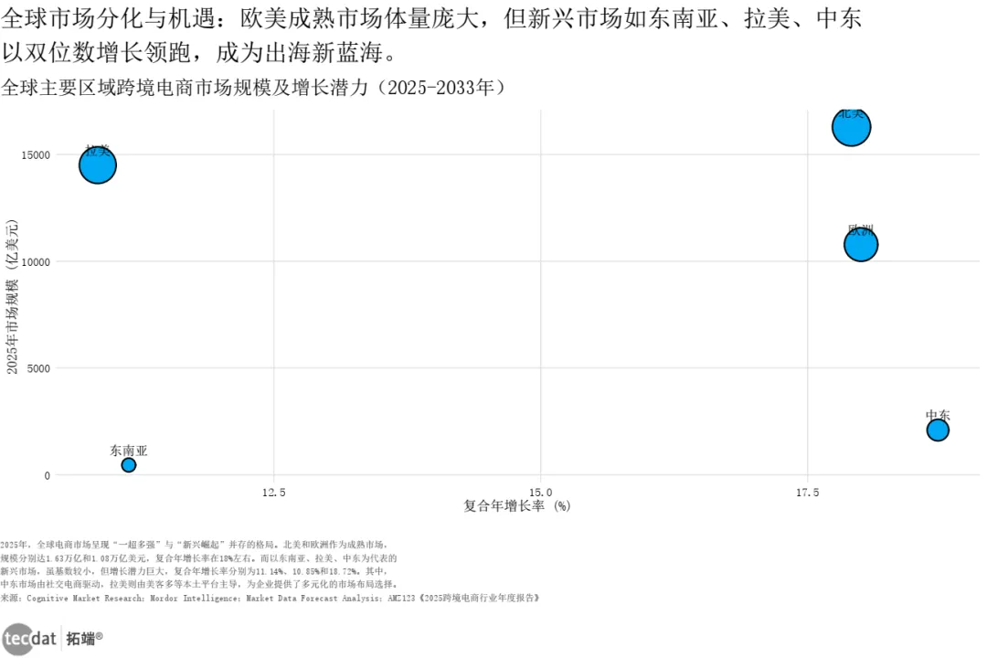 从区域看,北美和欧洲市场规模分别达1.63万亿和1.08万亿美元,CAGR约18%;东南亚、中东、拉美虽基数小,但增速均超10%,其中中东受社交电商驱动增长最快。