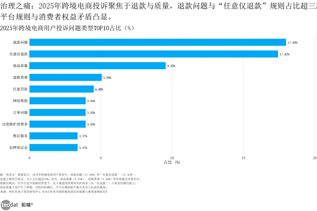 “电诉宝”数据显示,2025年跨境电商投诉TOP10中,退款问题(17.98%)和任意仅退款(17.42%)合计超35%,平台规则天平过度倾向消费者,导致商家生存压力激增。商品质量、退换货难等传统问题依然顽固。