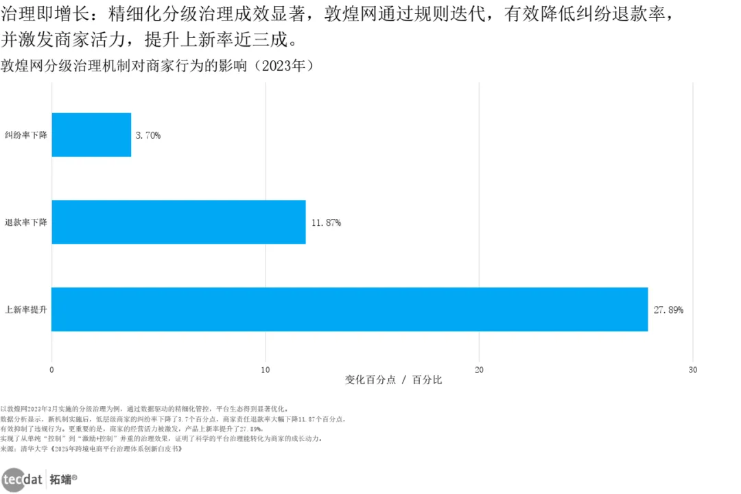 清华大学《2025年跨境电商平台治理体系创新白皮书》以敦煌网为例:2023年实施分级治理后,低层级商家纠纷率下降3.7个百分点,退款率下降11.87%,上新率提升27.89%。这说明精细化治理能化矛盾为动力。