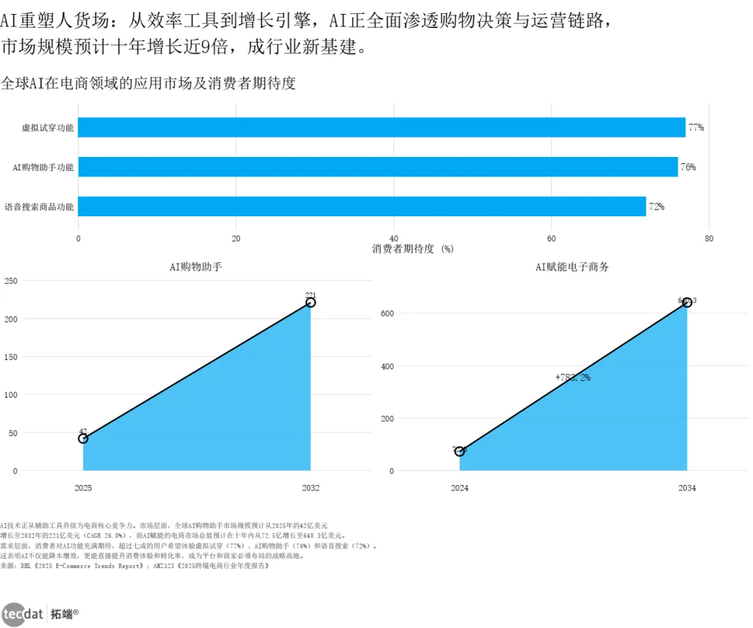AI正从辅助工具升级为电商核心竞争力。全球AI购物助手市场规模预计从2025年的42亿美元增至2032年的221亿美元(CAGR 26.8%);消费者中77%期待虚拟试穿、76%期待AI购物助手、72%期待语音搜索。
