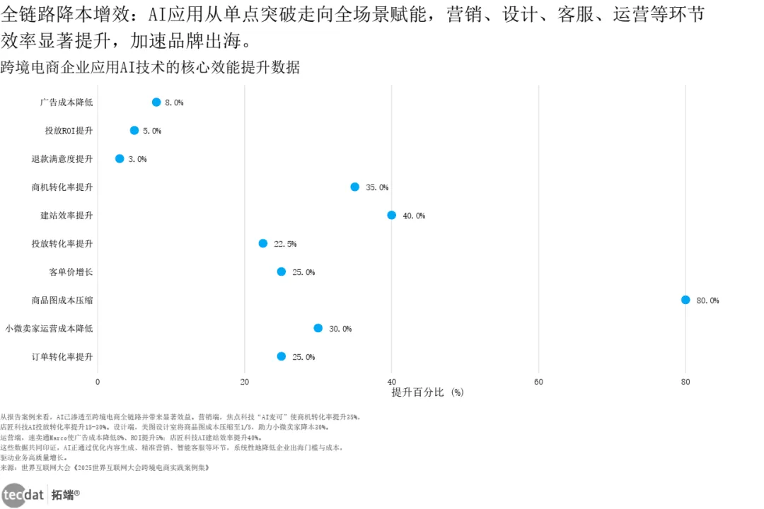 实践中,AI已渗透全链路:焦点科技“AI麦可”使商机转化率提升35%;美图设计室将商品图成本压缩至1/5;速卖通Marco让广告成本降低8%、ROI提升5%。