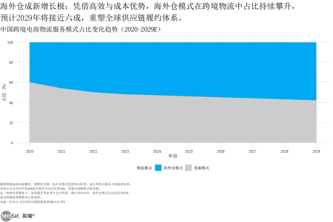 沙利文报告显示,中国跨境电商市场规模从2020年1.69万亿元增至2025年2.87万亿元,出口占比79%。物流模式中,海外仓占比从2020年40%升至2025年54%,预计2029年达58%,实现对直邮模式的反超。