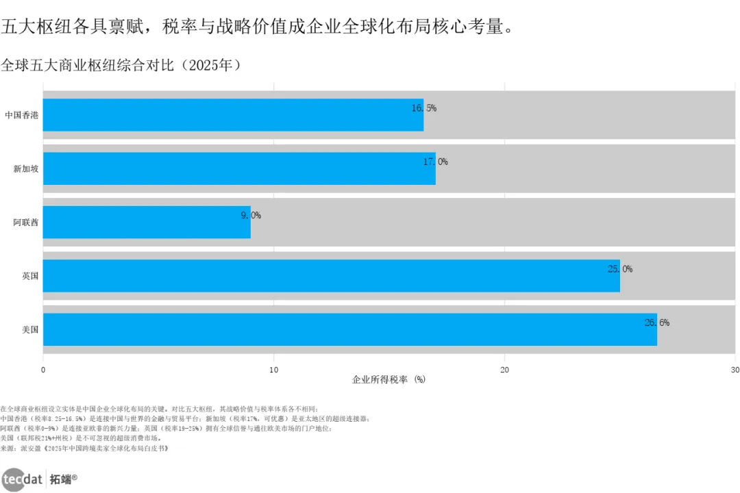 派安盈白皮书指出,中国香港、新加坡、阿联酋、英国、美国是全球化关键支点。企业所得税率:香港8.25-16.5%,新加坡17%(可优惠至5-10%),阿联酋0-9%,英国25%,美国21%+州税。