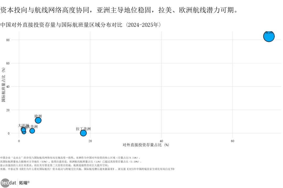 资本与人员流动协同:亚洲占对外投资70%、航班83%;欧洲航班占比11%已超投资占比5.4%,人员往来需求强劲。