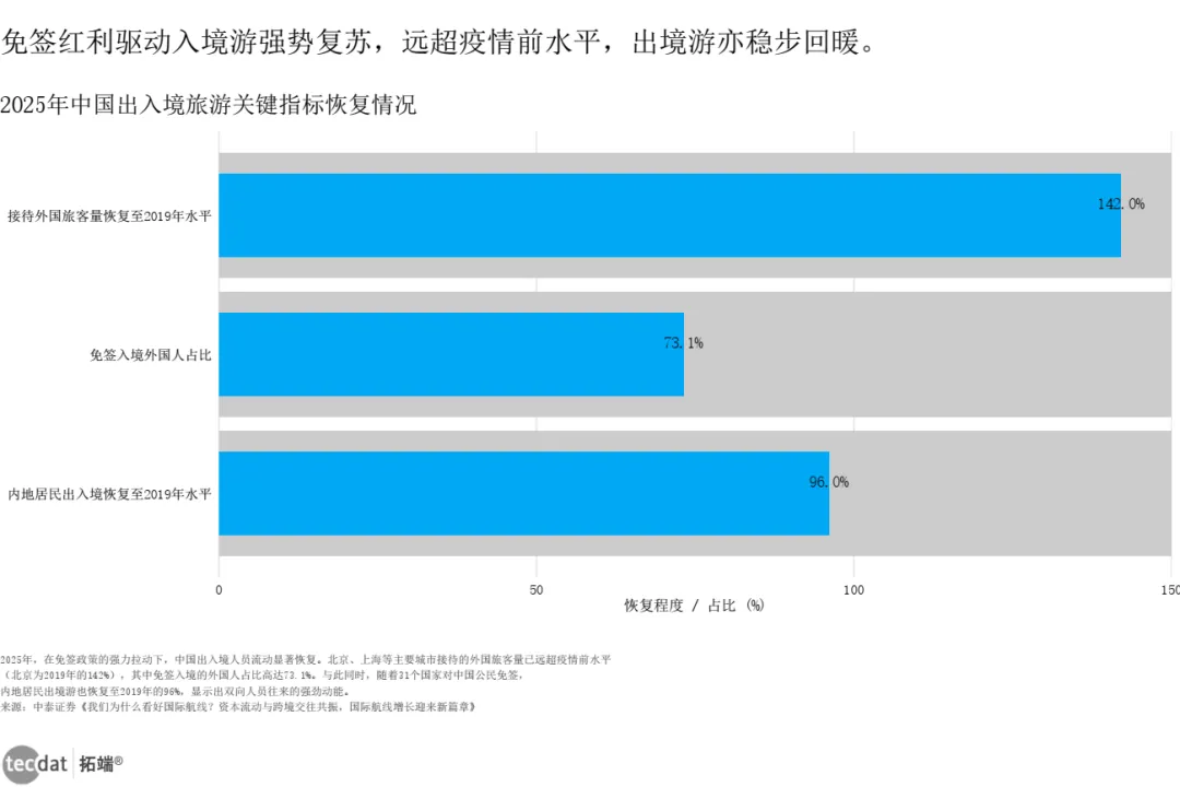 出入境游恢复:北京接待外国旅客量达2019年142%,免签占比73.1%,出境游恢复96%。
