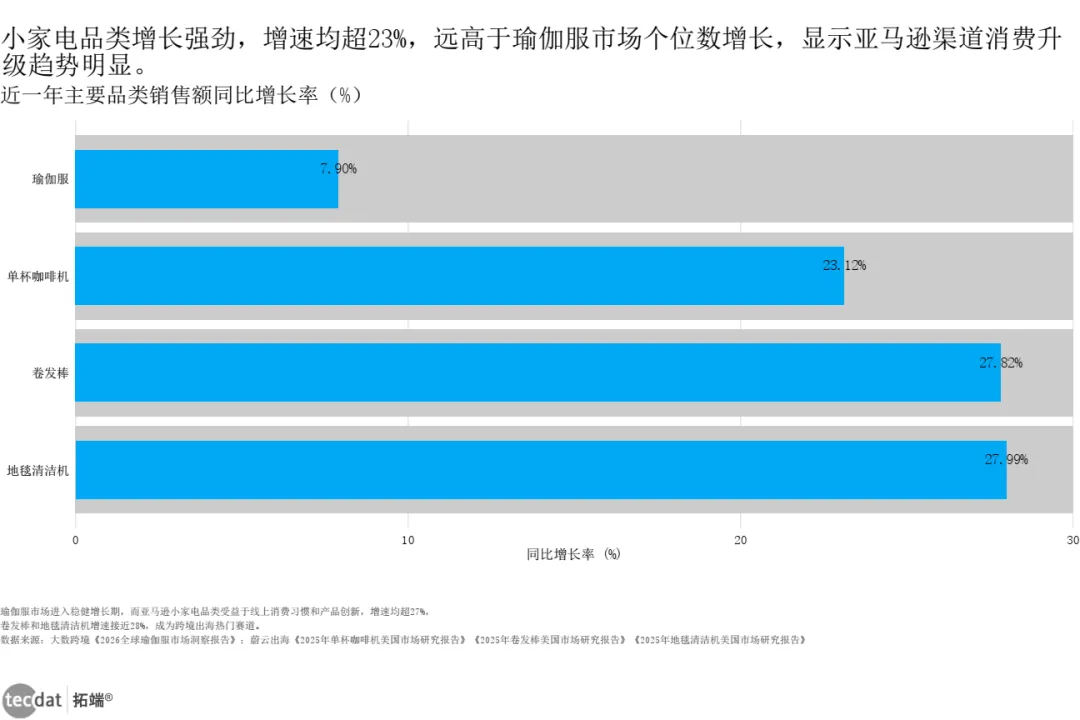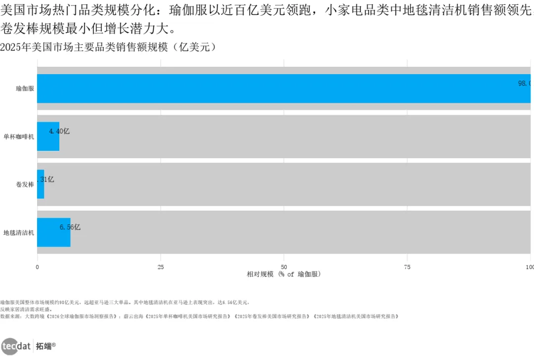 蔚云出海数据显示,2025年美国瑜伽服市场规模98亿美元,同比增长7.9%;亚马逊小家电中,地毯清洁机销售额6.56亿(+27.99%),单杯咖啡机4.4亿(+23.12%),卷发棒1.31亿(+27.82%)。