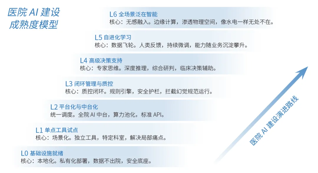 L0 为基础设施就绪层,核心是实现本地化与私有化部署,确保数据不出院,搭建起安全可控的 AI 底座;
