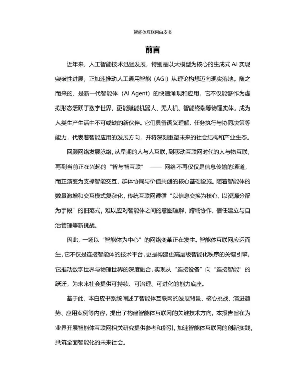 从技术架构到应用实践,从发展挑战到未来展望,这份白皮书全方位擘画智能体互联网发展蓝图,为行业创新实践提供重要参考。