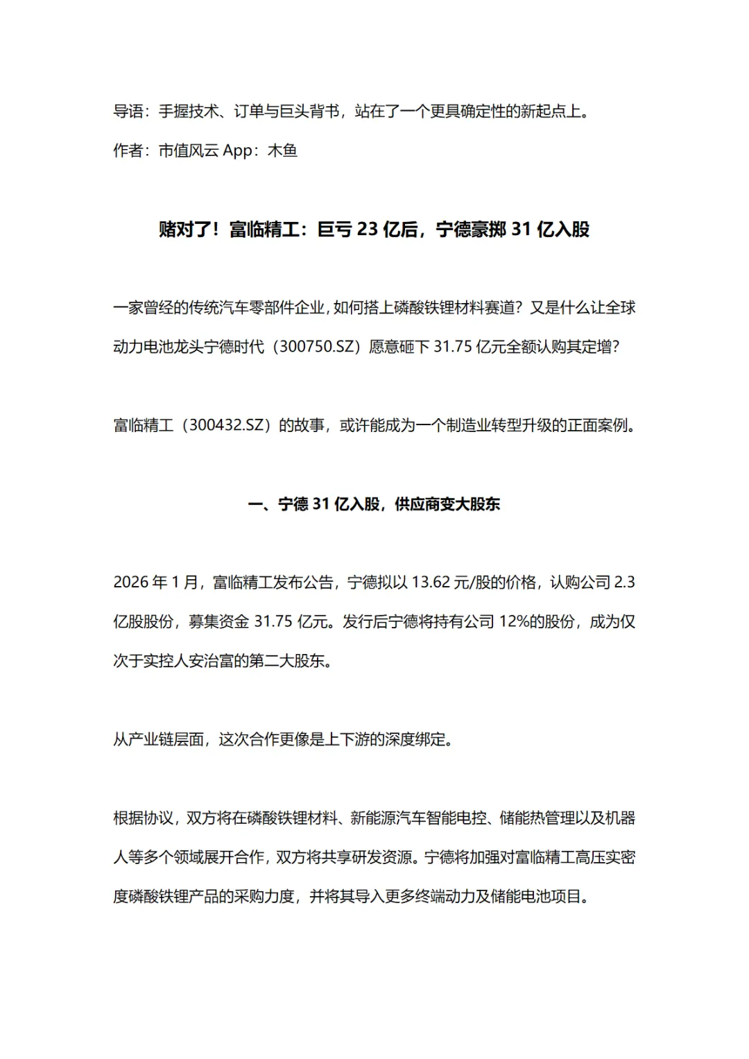 富临精工的转型升级,得到了宁德时代的真金白银投票和长期合作背书,站在了更具确定性的新起点上。虽然转型是否彻底成功还需时间验证,但目前看来,富临精工已手握技术、订单与巨头背书,前景可期。