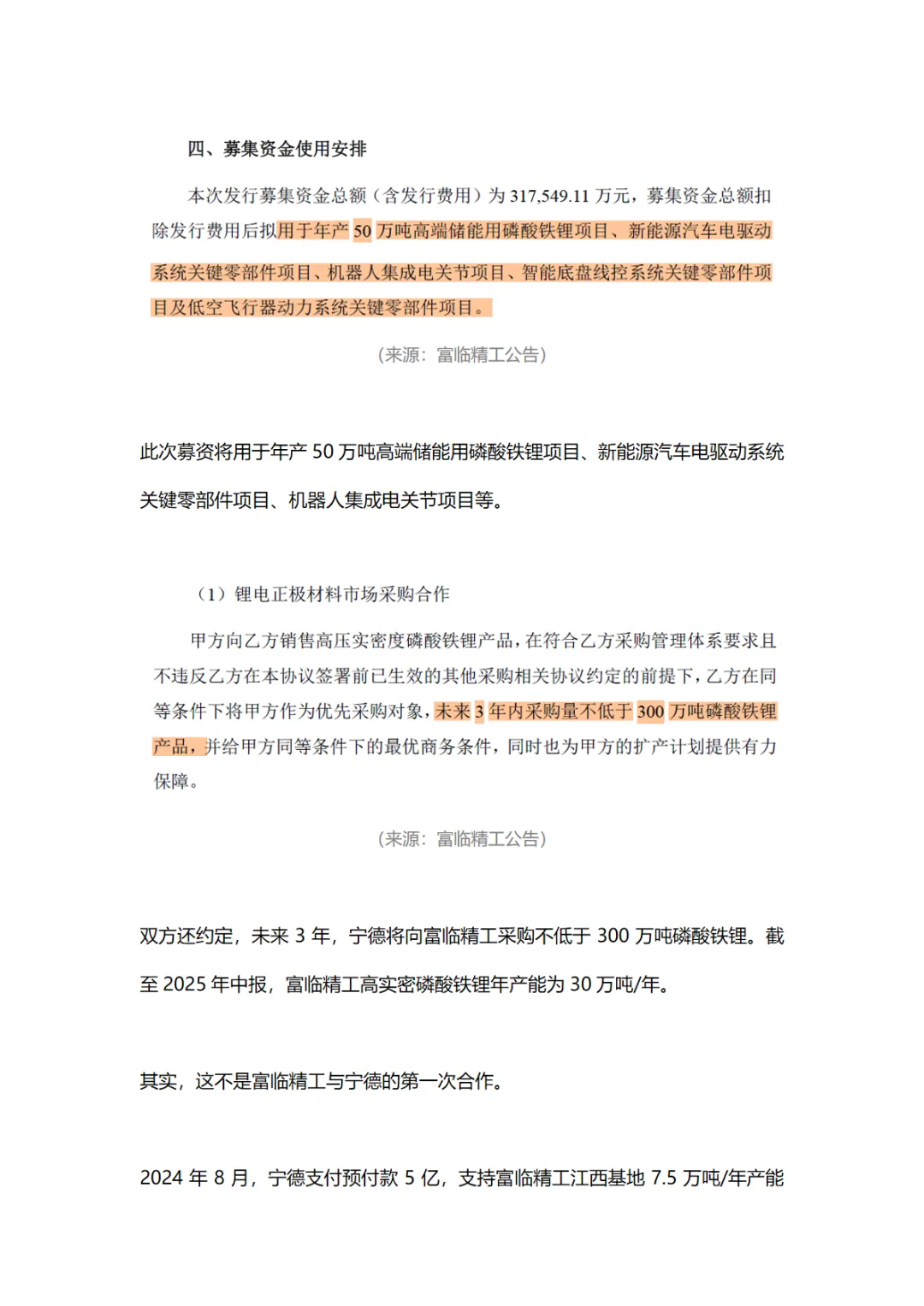 此次宁德时代的入股,不仅是对富临精工技术路线的认可,也是对其未来发展的看好。双方约定未来3年,宁德将向富临精工采购不低于300万吨磷酸铁锂,这一订单量远超富临精工目前的年产能。富临精工也计划通过新建项目,将磷酸铁锂产能提升至120万吨。