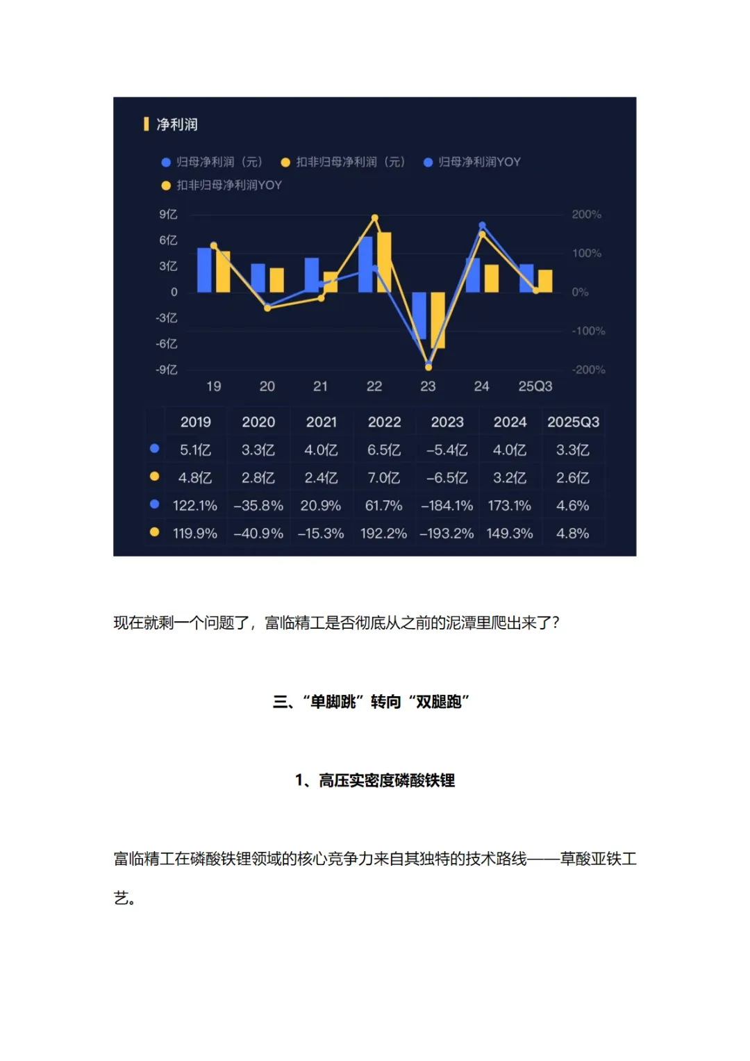 富临精工的转型之路并非一帆风顺。2015年,面对新能源汽车的崛起,富临精工通过收购江西升华进入锂电正极材料领域。然而,2019年行业洗牌导致业绩不及预期,公司一次性计提了巨额商誉减值损失和坏账损失,导致当年归母净利润巨亏23.2亿。但转折出现在2022年,富临精工实现了高压实密度磷酸铁锂材料的技术突破和规模化生产,并通过头部企业的认证,实现批量供应。