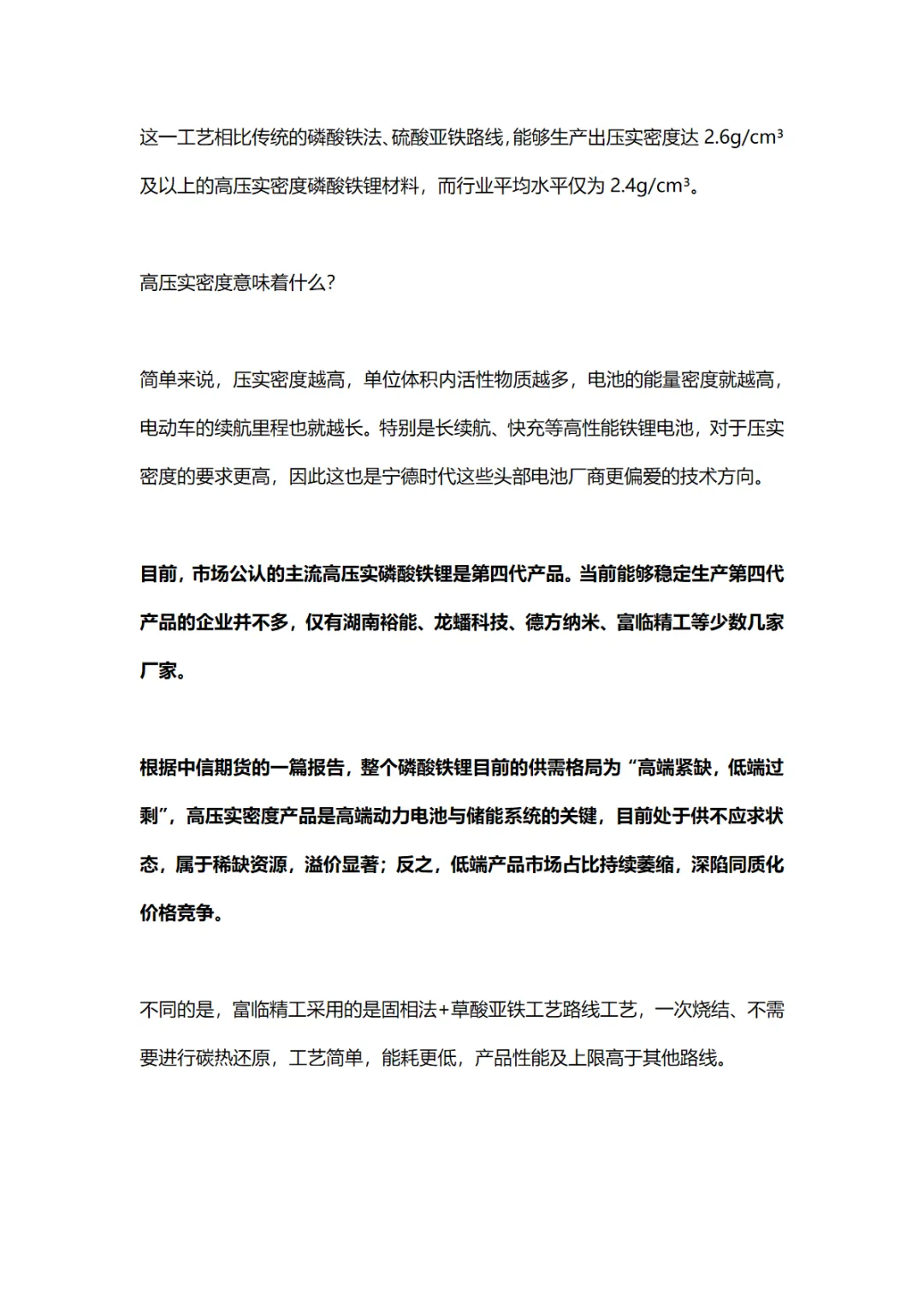 富临精工的核心竞争力在于其独特的草酸亚铁工艺,这一工艺能够生产出压实密度达2.6g/cm³及以上的高压实密度磷酸铁锂材料,远超行业平均水平。高压实密度意味着更高的电池能量密度和更长的电动车续航里程,这正是宁德时代等头部电池厂商所偏爱的技术方向。