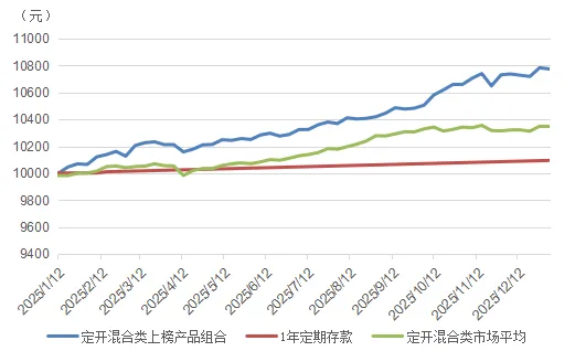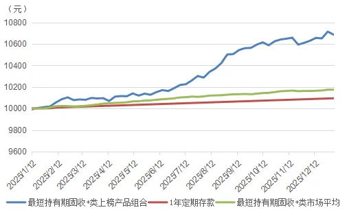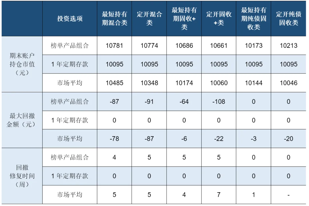 以“最短持有期混合类”和“最短持有期固收+类”产品为例:假设在2025年年初对榜单产品组合进行投资,初始资金1万元,持有至年末,“最短持有期混合类”榜单产品组合持仓市值增长至10781元,“最短持有期固收+类”榜单产品组合持仓市值增长到10686元,均显著高于1年期定期存款的10095元。在风险控制方面,“最短持有期固收+类”和“最短持有期混合类”榜单产品组合虽经历回撤,且最大回撤金额分别为64元和87元,但二者仅用5周和4周即完成回撤修复。综合来看,相较于市场平均及定期存款,各分类上榜产品过去一年投资收益优势显著,展现出良好的收益韧性与下行风险抵御能力。