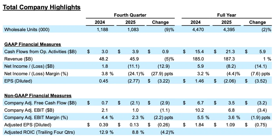 通用汽车2025年净利润同比下滑55%至26.97亿美元,其中第四季度净亏损就高达33.1亿美元。