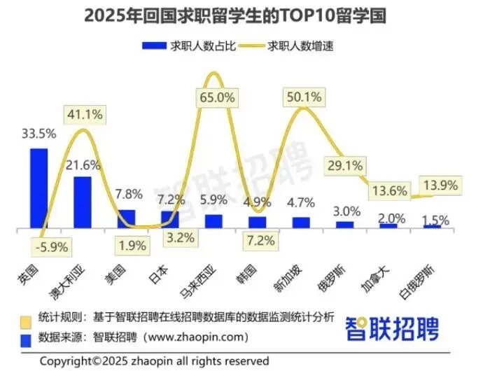 英国、澳大利亚、美国依然是海归留学的主要目的地,但马来西亚、新加坡等亚洲国家的留学生回国求职人数增速迅猛,分别高达65.0%和50.1%,远超欧美传统留学地。