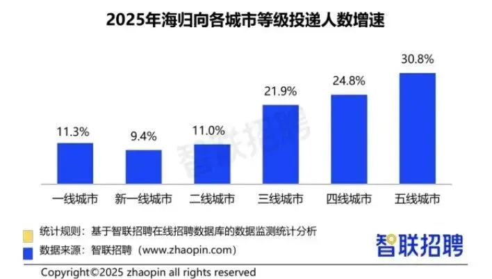 2025年,海归向五线城市投递简历的人数同比增长30.8%,向四线、三线城市投递的增速也分别达到24.8%和21.9%,均显著高于一线及新一线城市。