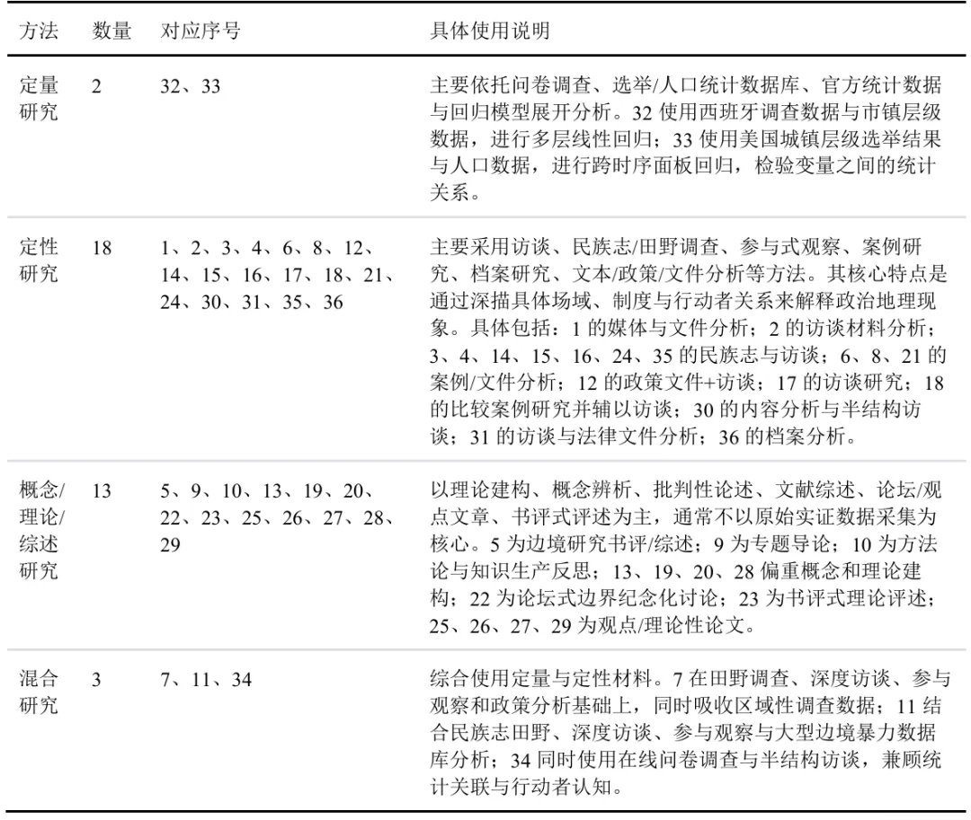 定性研究占据绝对主导地位。多数论文(如文献1、2、3、4、6、14、16、17、30、31、35、36等)主要采用案例研究、半结构访谈、民族志田野、参与观察、政策文本分析、档案研究等典型质性路径,聚焦政治地理现象的生成过程、空间实践及其权力逻辑。在边境与迁移研究中(如文献3、4、14、16、17),研究者普遍通过访谈、长期田野和制度文本分析,揭示边境管控、庇护程序、语言治理与团结实践如何在日常生活层面塑造“安全”“归属”与“排斥”的空间秩序;在技术与治理议题中(如文献1、2、21、30、36),学者通过政策文件、专家材料、案例追踪与制度分析,讨论战略技术、数字识别、水资源调配和基础设施建设如何重组国家能力、主权边界与区域权力关系;在环境与地方政治研究中(如文献31、35),定性方法则被用于呈现生态保护、旅游开发与地方社会之间的协商、冲突与日常地缘政治实践。总体来看,定性方法在本批文献中承担了最主要的解释功能,尤其擅长把握空间、权力与主体经验之间的关系性机制。