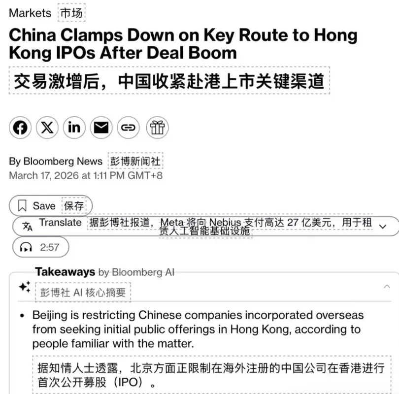 另外恒科这几天稳住之后,今天彭博有一篇收紧港区IPO的文,目前尚未验证。