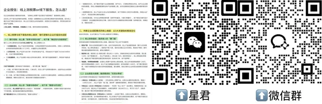 线上税票产品与线下写报告,本质是银行针对不同企业需求设计的差异化融资工具:线上胜在“效率与便捷”,适配小微企业短期周转需求;线下胜在“额度与灵活”,适配中大型、快速成长型的企业发展需求。