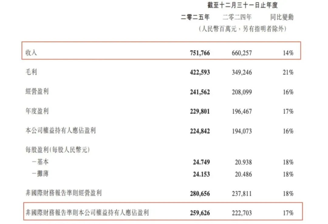 2025年营业总收入7518亿,同比增长14%,非国际准则归母净利润2596亿,同比增长17%。 营业收入与我预测的偏差为2.5%,非国际准则归母净利润与我预测的偏差为1%。