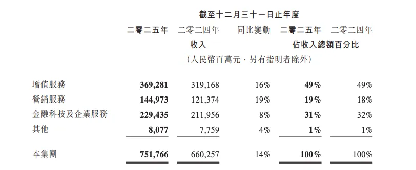 细分来看,增值业务,营销服务,金融科技及企业服务的收入如下: