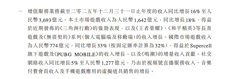 其中,增值业务收入 3693 亿,同比增长 16%,本土游戏收入 1642 亿,海外游戏收入 774 亿,社交网络收入为 1277 亿。
