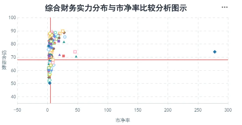 在公司的发展能力、经营稳定性及增长潜力的基础上,结合公司主营业务所属行业的分析、资产结构或资产质量分析、主营业务运营效率分析、受评主体的行业地位分析以及偿付能力的分析做出的公司综合财务实力分析判断。分数越高,公司的综合财务实力越强。处在右下区域的公司,市净率较高且相关指数较低,则存在公司综合财务实力不足的潜在风险。