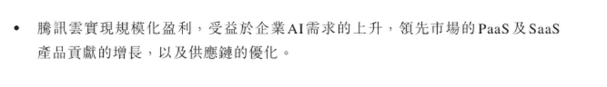 另一个关键是云业务——腾讯云终于实现了全年规模化盈利。虽然是首次,但是云业务的盈利说明一个AI关键的赚钱模式跑通了,甚至剧透了一些接下来AI行业回本的路子。